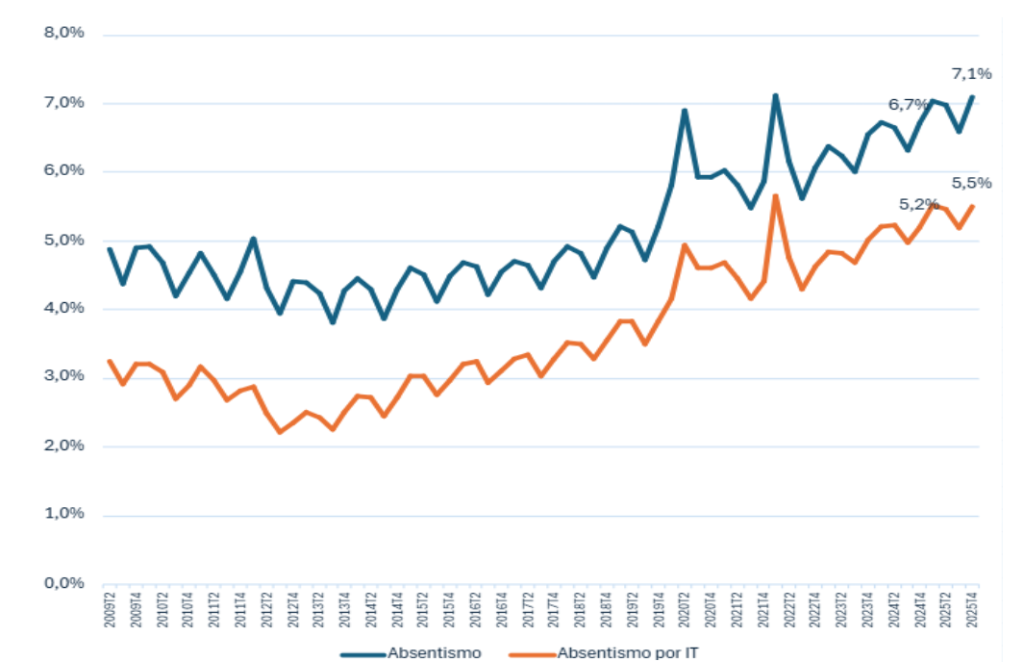 El absentismo laboral alcanza el 7,1% a cierre de 2025, rozando máximos históricos tras repuntar cuatro décimas.