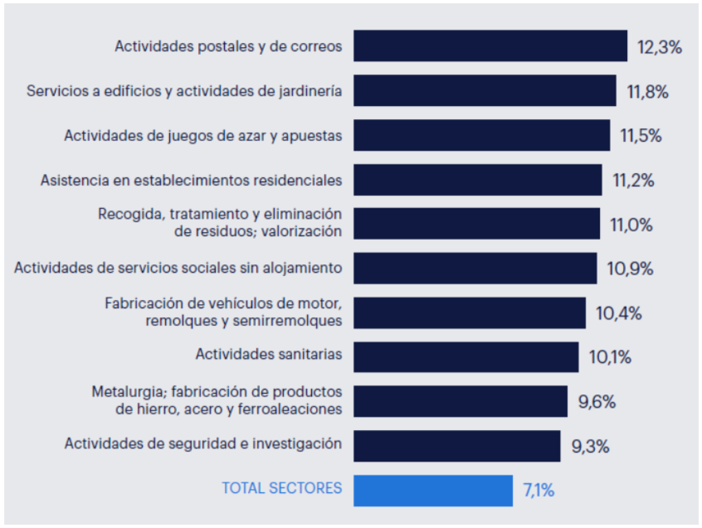 El análisis detallado por ramas de actividad pone de manifiesto diferencias significativas, con sectores que registran niveles reducidos frente a otros con un elevado volumen de horas perdidas. Así, las actividades que presentan un mayor absentismo son Actividades postales y correos (12,3%), Servicios a edificios y jardinería (11,8%), Juegos de azar y apuestas (11,5%), Asistencia en establecimientos residenciales (11,2%) y Recogida, tratamiento y eliminación de residuos (11%). Por el contrario, las actividades con menor absentismo son las relacionadas con el Empleo (2,9%), Jurídicas y contabilidad (3,1%), Inmobiliarias (3,6%), Edición (3,7%) y Servicios técnicos de arquitectura e ingeniería (3,7%).
