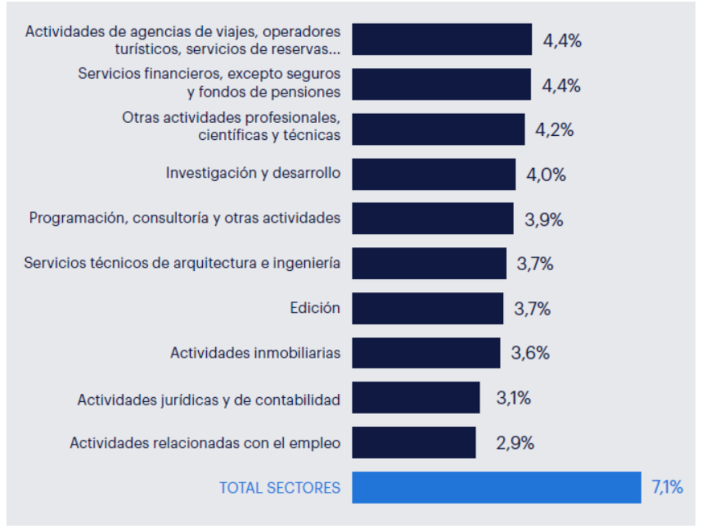 - Por actividades, el mayor absentismo se produce en actividades postales y correos (12,3%), servicios a edificios y jardinería (11,8%) y juegos de azar y apuestas (11,5%), mientras que el menor se da en tareas relacionadas con el empleo (2,9%), jurídicas y contabilidad (3,1%) e inmobiliarias (3,6%)