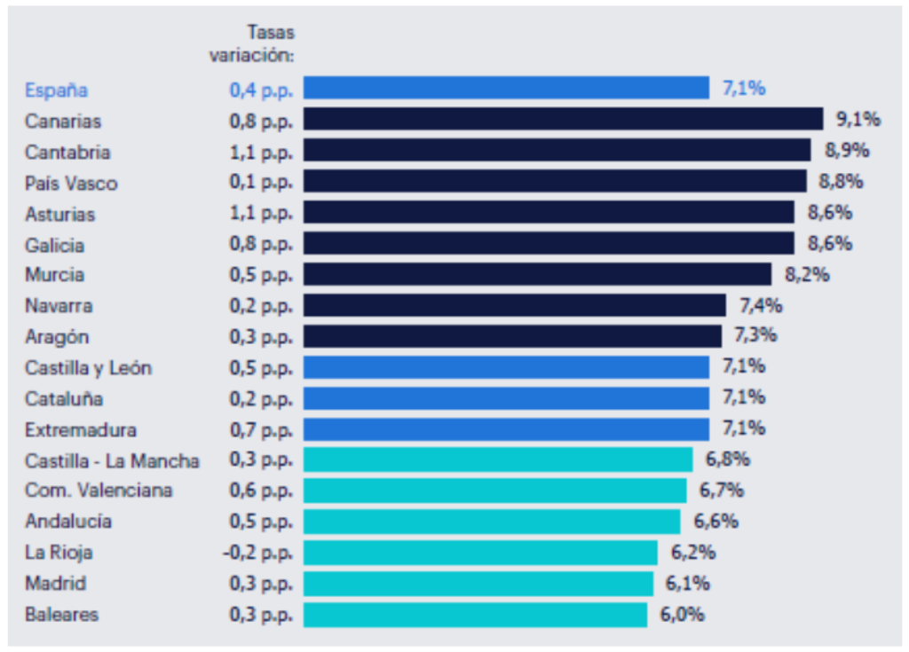 En términos de evolución, los mayores incrementos se han producido en Cantabria, con un aumento de más de un punto porcentual hasta el 8,9%, y en Asturias, con un avance de un punto hasta el 8,6%. También destacan los incrementos de Canarias y Galicia, ambos de ocho décimas, hasta el 9,1% y el 8,6%, respectivamente. Por el contrario, La Rioja es la única comunidad que registra un descenso, de dos décimas, hasta el 6,2%. En el resto, las variaciones han sido muy contenidas, de una o dos décimas, como en País Vasco (8,8%), Navarra (7,4%) y Cataluña (7,1%).
