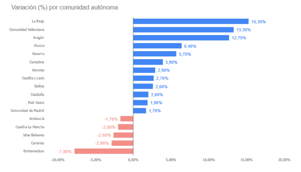 - La Rioja (+15,3%), Comunidad Valenciana (+13,3%) y Aragón (+12,7%) son las regiones que registraron un mayor aumento de la contratación