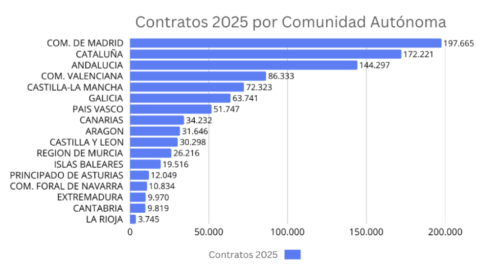 La Comunidad de Madrid también se sitúa a la cabeza en aumento de contratación interanual, con un 17,6% más de firmas, hasta alcanzar las citadas 197.665, lo que supone 29.603 más que en 2024. Muy cerca, la Comunidad Valenciana aumentó un 13,1%, hasta 86.333 contratos, y Cataluña creció un 9%, hasta 172.221 firmas. Castilla-La Mancha también destacó por su incremento interanual, con un 9% más de contratos, alcanzando los 72.323.