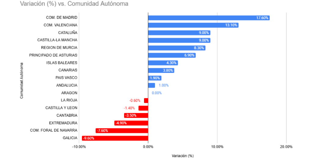 Entre las comunidades con crecimientos moderados destacan Asturias (6,9%), Región de Murcia (8,3%) e Illes Balears (4,3%), mientras que Andalucía (1%) y el País Vasco (1,9%) tuvieron incrementos más discretos. La Rioja prácticamente se mantuvo estable, con un ligero descenso del 0,6%.