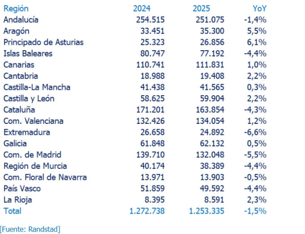 En el lado opuesto, las caídas más pronunciadas se han registrado en Extremadura, con un descenso del 6,6%; la Comunidad de Madrid, con un 5,5% menos de firmas que el año anterior; y la Región de Murcia, el País Vasco e Islas Baleares, que han reducido su volumen un 4,4%, y Cataluña (-4,3%). Estas diferencias ponen de manifiesto una evolución dispar del sector, influida por factores como la demanda turística, la estacionalidad o el ajuste del mercado laboral tras años de fuerte crecimiento.