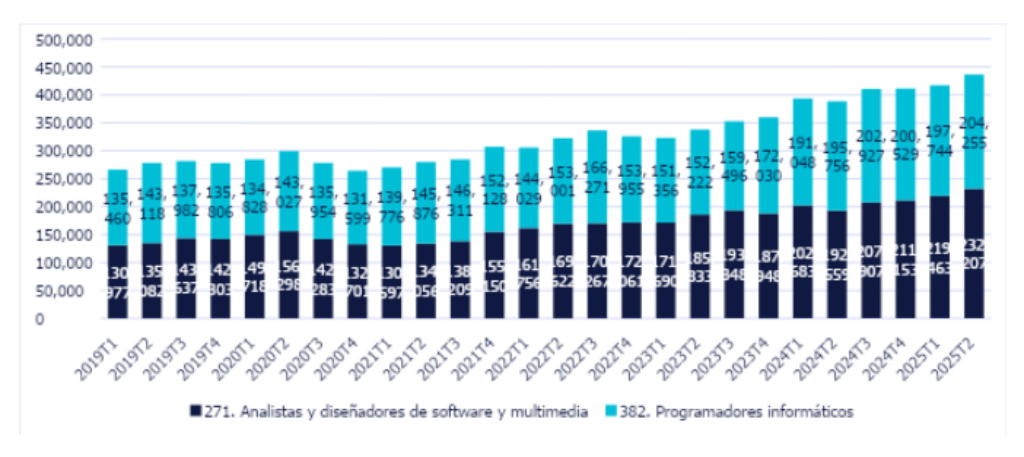 Esta ocupación se divide en dos grandes grupos: el de Analistas y diseñadores de software y multimedia, con 232.207 trabajadores y el 53% del total; y el de Programadores informáticos, con 204.255 asalariados, el 47%. El primer grupo ha crecido el último año un 20%, mientras que el segundo lo ha hecho un 4%.