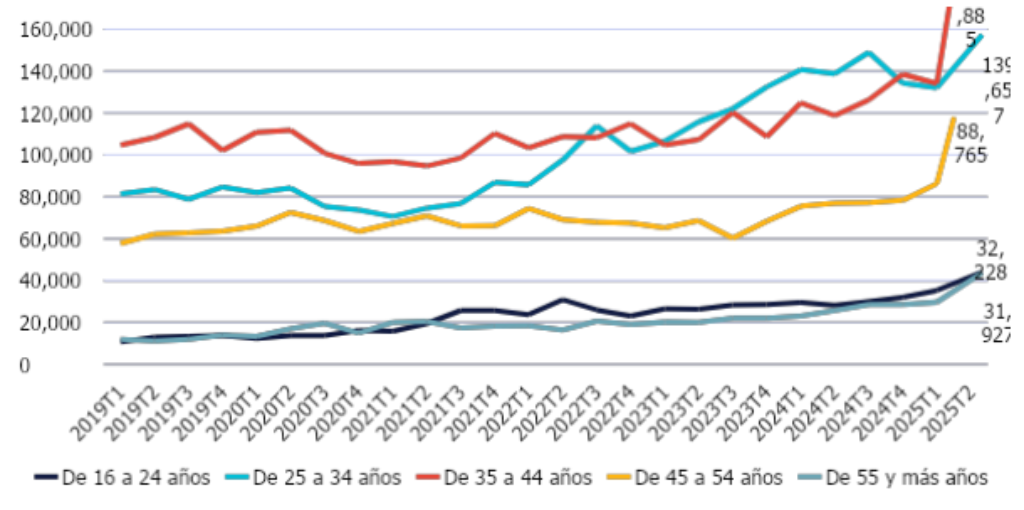 En contraposición a otros sectores del mercado laboral, el empleo en este campo es relativamente joven. A lo largo de toda la serie histórica, el segmento de edad predominante ha sido el grupo de 25 a 34 años, aunque desde el cuarto trimestre de 2024 ha sido superado por el de 35 a 44 años.