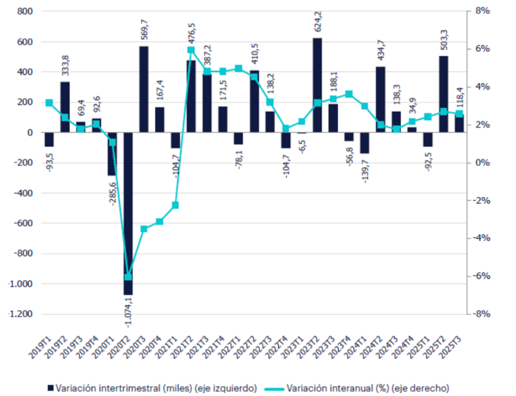 Todo ello, además, en un contexto de reducción del desempleo también de forma importante. Al cierre del tercer trimestre, según los datos de la EPA, la tasa de paro se situó en el 10,45%, casi ocho décimas menos que el 11,2% registrado en el tercer trimestre de 2024. Por su parte, la afiliación a la Seguridad Social aceleró ligeramente su crecimiento, situándose en un alza interanual del 2,35% en septiembre pasado.