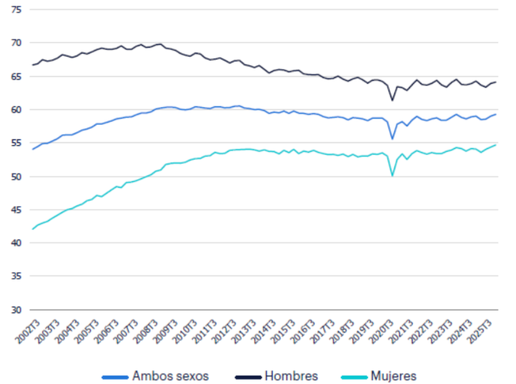 La tasa de actividad se situó en septiembre en el 59,3%, con una diferencia entre hombres y mujeres de 9,4 puntos a favor de los primeros. En el contexto europeo, la tasa de actividad en España se sitúa entre las más bajas de la UE como consecuencia de la menor participación en el mercado laboral de población a partir de los 55 años, por las mayores prejubilaciones o, simplemente, abandono del empleo. También influye la menor participación femenina, sobre todo a partir de la población con 50 años.