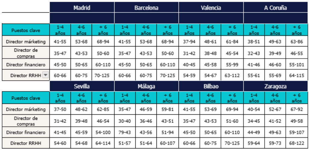 Tabla salarial de los puestos clave del sector retail (horquillas en miles de euros) de acuerdo con los años de experiencia en la empresa