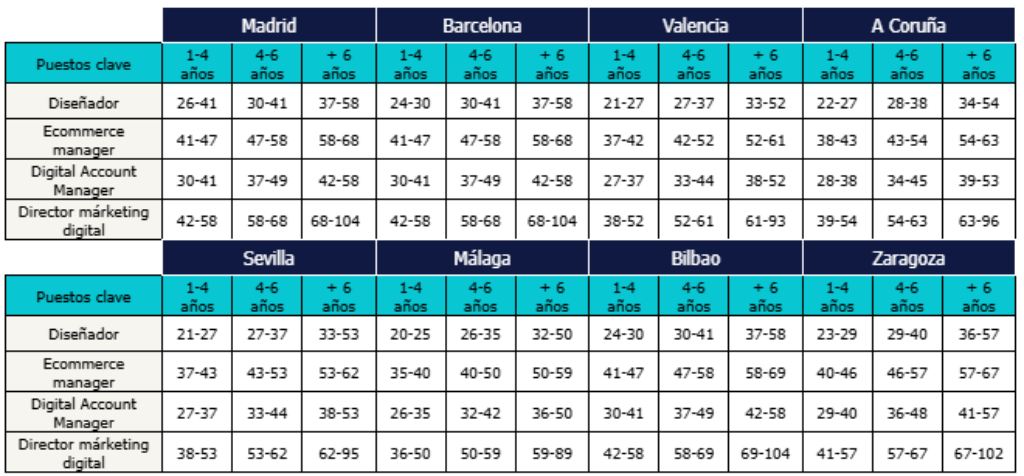 Tabla salarial de los puestos clave del sector Digital & Ecommerce (horquillas en miles de euros) de acuerdo con los años de experiencia en la empresa