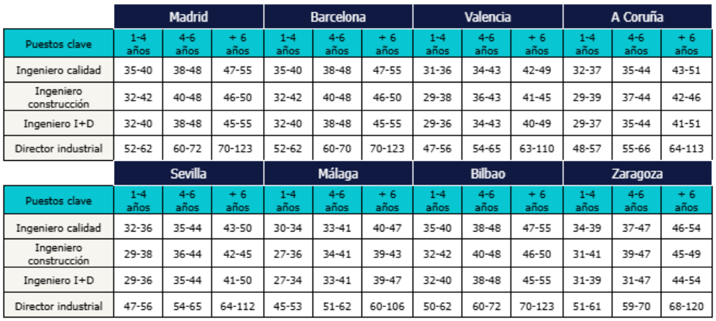 Tabla salarial de los puestos clave del sector ingeniería (horquillas en miles de euros) de acuerdo con los años de experiencia en la empresa