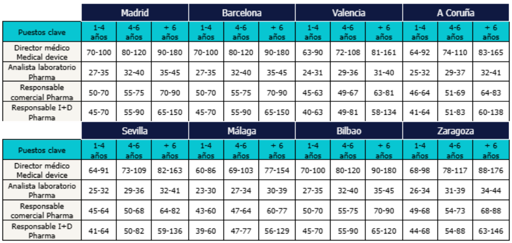 Tabla salarial de los puestos clave del sector life sciences (horquillas en miles de euros) de acuerdo con los años de experiencia en la empresa