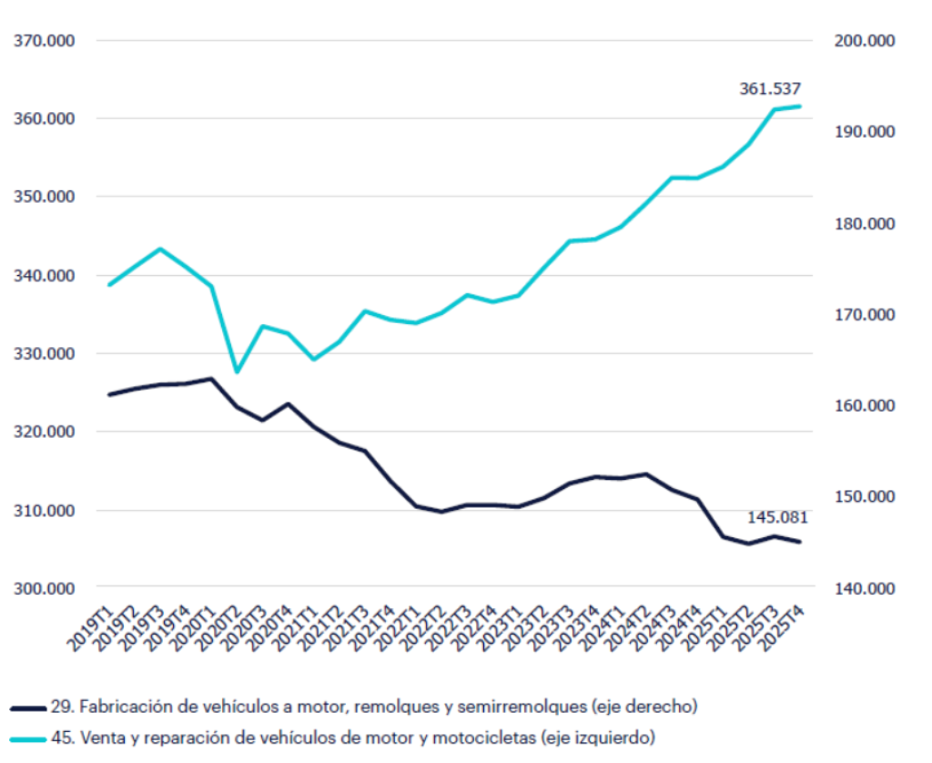 El comportamiento del empleo fue desigual entre las dos grandes ramas que componen el sector. Mientras que Venta y reparación de vehículos de motor y motocicletas registró un crecimiento del 9,7% en el último trimestre de 2025, la Fabricación de vehículos de motor, remolques y semirremolques experimentó una caída interanual del 4,6%.